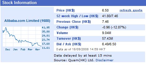 Hong Kong, November 11, 2008 – Alibaba.com Limited (HKSE:1688), the world's leading B2B e-commerce company, today posted financial results for the quarter ended September 30, 2008. The company also announced that its board of directors has authorized a share repurchase program of up to HK$2 billion (approximately US$258 million) through the end of 2009.
