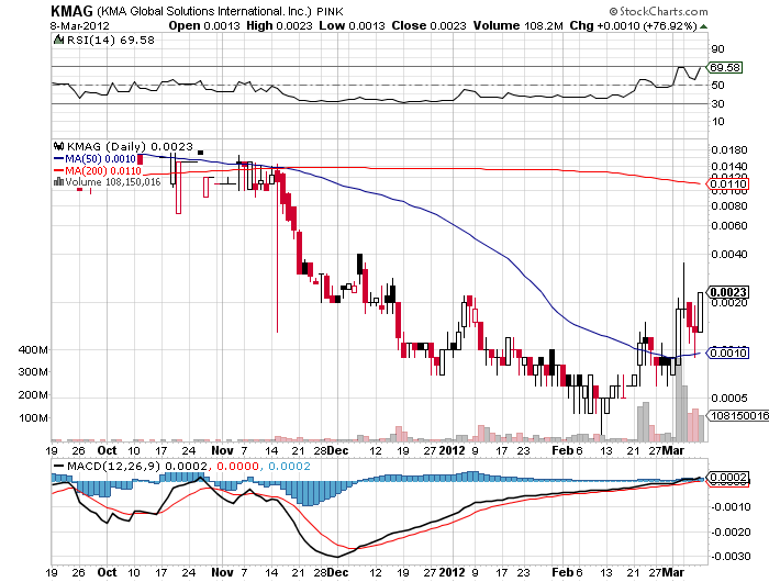 aber seit letzten wochen grosses volumen in den aktienhandel von kma für einen subpennystock, jedesmal wenn ich hoffe jetzt geht hoch bricht der kurs aber wieder zusammmen. heute wird aber auf jedenfall wieder interresant da gestern wieder über 0,002 geschlossen hat meiner meinung nach.