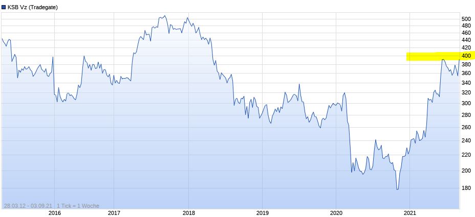 Anfang November 2019 bin ich bei KSB eingestiegen, zu einem durchschnittlichen Stückpreis von €230,80. Inzwischen steht sie mit über 72% im Plus und ich bin froh, noch kein einziges Stück wieder hergegeben zu haben. Die Dividende zwar bescheiden, aber ich möchte sie noch halten, bis mein Kursziel von €450 erreicht ist - evt. aber auch darüber hinaus, denn KSB ist letztlich auch eine "Wasseraktie" (s. Abschnitt "Wassertechnologieunternehmen" in diesem Artikel hier) und hat IMO schon insofern gute Zukunftsaussichten.