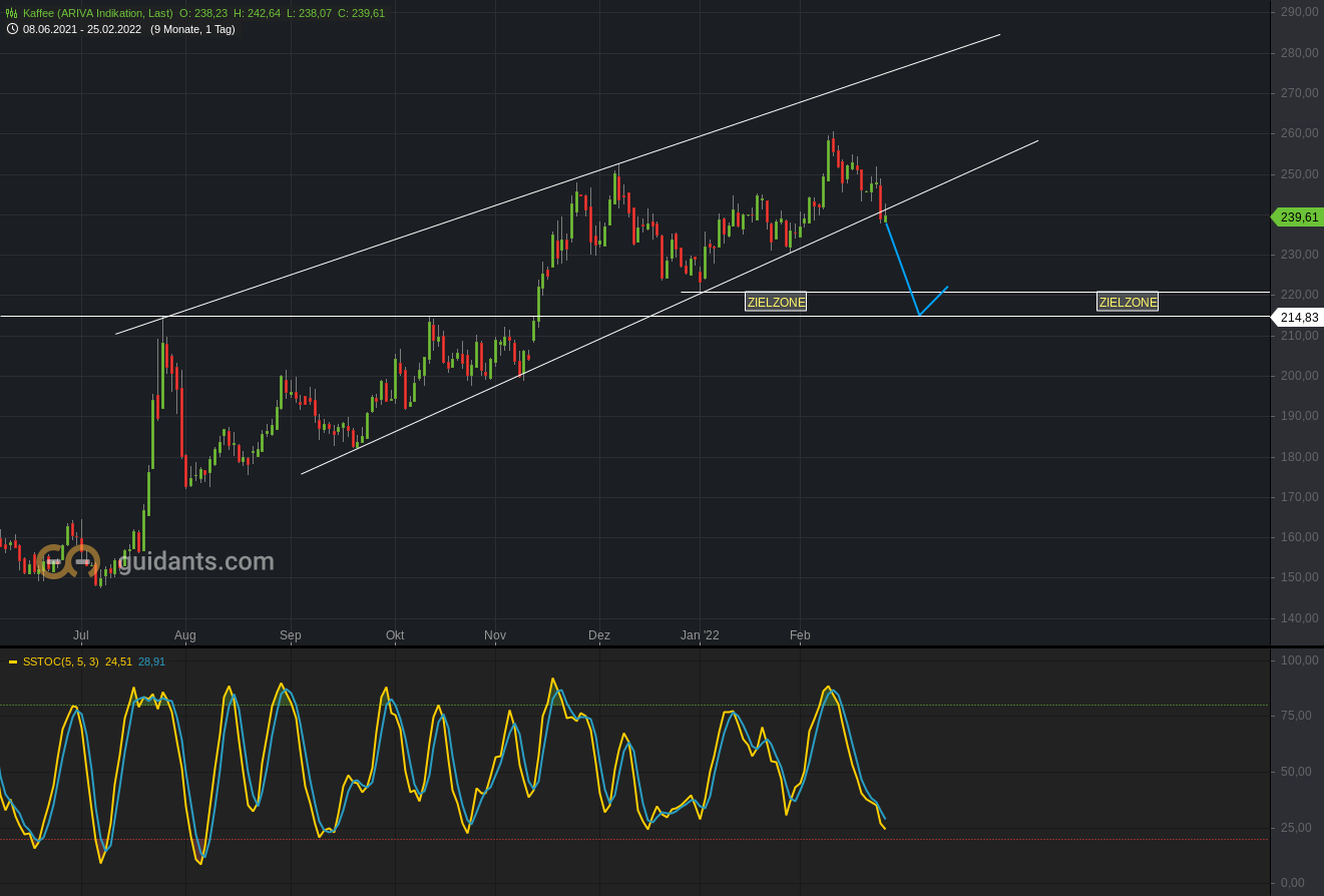 Timing nahezu perfekt. Der Markt konzentriert sich nun auf wichtigere Rohstoffe, die nach oben streben. Die schmackhafte Bohne ist nun ausgereizt und tritt nun die Reise nach Süden an!
