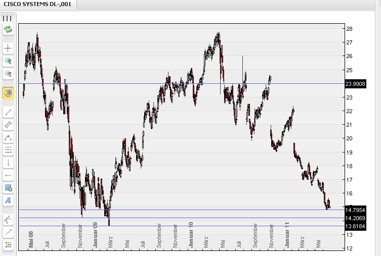 Die Amis sollten jetzt bald ihre Defizitgrenze anheben/klären und die Wirkung des Auslaufens von QE2 (30.06.) auf den Aktienmarkt sollte sich auch zeigen. Die Griechenland-Klärung hat den DOW schon nach oben geführt, wenn die 2 anderen Dinge dann auch klar sind ... gehts vielleicht weiter nach oben ... mit Cisco dann vielleicht auch.
