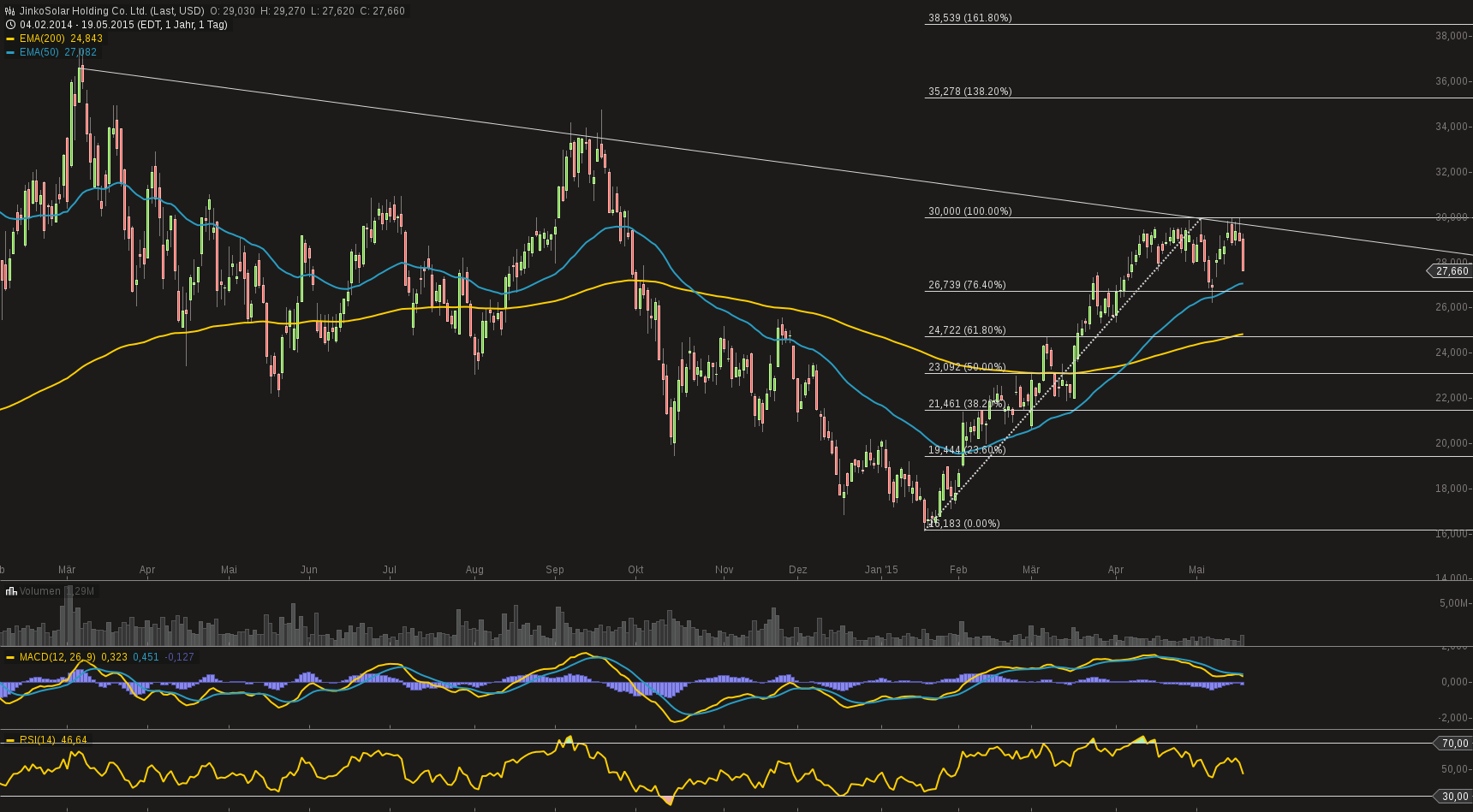 Dazu liegt das Handelsvolumen und somit gewissermaßen das Interesse/Momentum inzwischen weit unterm Schnitt...die Ralley seit Jahresstart (+85%) ging bisher ohne nennenswerte Korrektur von statten...und man konnte die letzten Wochen förmlich spüren, wie die Luft immer dünner wurde. Der Markt hält sich aufs Höchststand, Jinko kann vor den Zahlen nicht ansatzweise folgen.