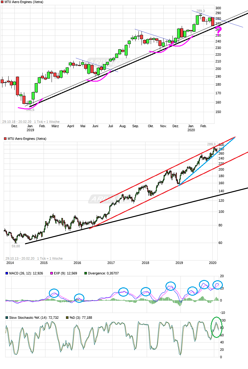 "..Bei ca. 263,67 EUR verläuft heute der Aufwärtstrend seit Januar 2019. Vorbörslich notiert die Aktie also unter diesem Aufwärtstrend. Sollte sich dieser Trendbruch bestätigen, dann könnte es in der MTU-Aktie zu einer größeren Konsolidierung kommen. Abgaben bis 257,20 EUR, 247,00 EUR und sogar 229,10 EUR wären dann möglich. Sollte sich die MTU-Aktie aber im heutigen Handel wieder fangen und über 266,30 EUR schließen, könnte es zu einem Anstieg in Richtung des Allzeithochs bei 289,30 EUR kommen.