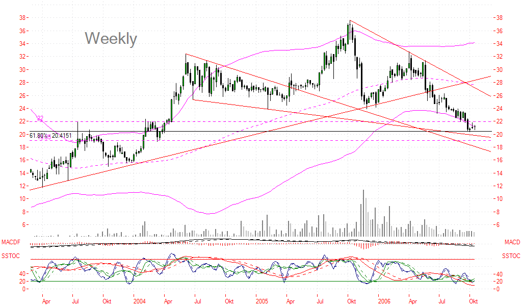 € 19,50 und 22 ein Boden zustande kommt. Den Tiefpunkt erwischen wir bekanntlich nie, also ist das nicht besonders tragisch, wenn man in dieser Zone eine Position erwirbt und ein Nachkauflimit knapp unter € 20 einrichtet. Das Abtauchen unter die Grenze € 22 iritiert mich allerdings schon etwas, der Bereich hätte doch eigentlich halten sollen, darum lege ich ein SL bei € 19, um möglichen negativen Meldungen vorzubeugen, die sich im momentan schwachen Chartbild ja durchaus vorab schon abbilden können und nur Vorläufer von weiterer Kursschwäche sein könnten. Insgesamt bin ich von Masterflex und seinem Geschäftsmodell überzeugt und rechne fest mit einer positiven Zukunft, ein Investment in Masterflex kann aber einige Geduld benötigen. Ich bin auf jeden Fall drin.