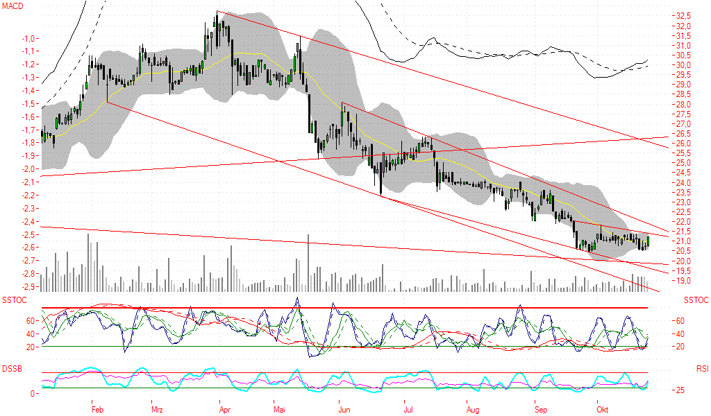 sieht gut aus, ich vermute, die Aktie möchte steigen. Am Dienstag 14.11. kommt der Q3-Bericht. Die Aktie liegt ja aufs ganze gesehen wirklich am Boden, und es gab doch zuletzt nur Nachrichten, die Gutes andeuteten (Dicota wird doch nicht verkauft, weil sie schlicht zu profitabel ist), und schon der letzte Q-Bericht war zu gut als dass die Aktie danach noch hätte sinken dürfen (damals von 23,40 aus). Ich bin mal bei 22,00 eingestiegen und optimistisch :-) Aber ich betone, dass ich keine Ahnung habe :-))