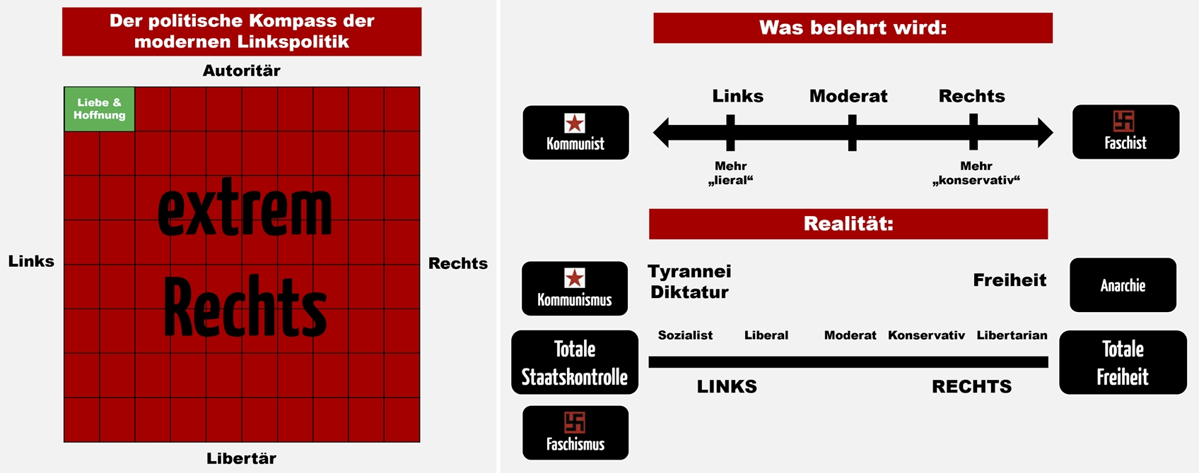 b) Faschis haben gerne "Totale Staatskontrolle", somit wäre es nicht nur verkehrt, aber viel schlimmer sogar UNFAIR sie in den rechten Bereich "Totale Freiheit" zu zwingen
