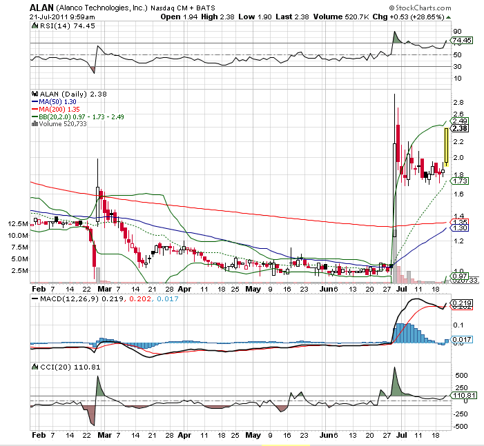 Shares of ALAN soared past 132% gains yesterday as the Company announced a definitive­ merger deal with YuuZoo Corp., a global provider of mobile targeted social networks, targeted advertisin­g and mobile payment systems."