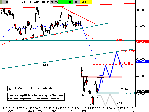 Der jüngste Abverkauf (Sturz von 28 auf 23 Dollar) hatte seine Ursache darin, dass MSFT 2,6 Mrd. Dollar in seine Internet-Aktivitäten stecken will: Die Suchmaschine von MSN soll zur ernsthaften Konkurrenz für Google ausgebaut werden. Ballmer hat dies heute noch einmal auf einer Pressekonferenz bekräftigt, was einen weiteren Abverkauf auf 22,75 ausgelöst hat. Ballmer meinte, MSFT habe "einfach zuviel Geld".