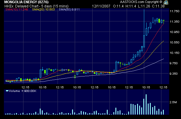 Mongolia E +12% 276 MONGOLIA ENERGY 13.88 1.58 12.85 302,862 22,712