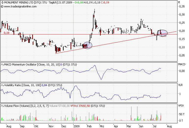 Seit der Haywood-Studie Anfang Februar 2009 konnte Monument Mining mit dem Beginn des Tagebaus einen weiteren Meilenstein erreichen. Wir bleiben bei unserer Bewertung und sehen un verändert ein Kurspotenzial von 1,00 EUR je Aktie auf Sicht von 12 Monaten. Bei einem aktuellen Kurs von 0,19 EUR eine sehr gute Einstiegsmöglichkeit bei einem angehenden margenträchtigen Goldproduzenten.
