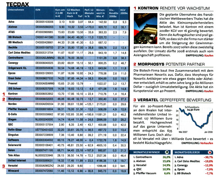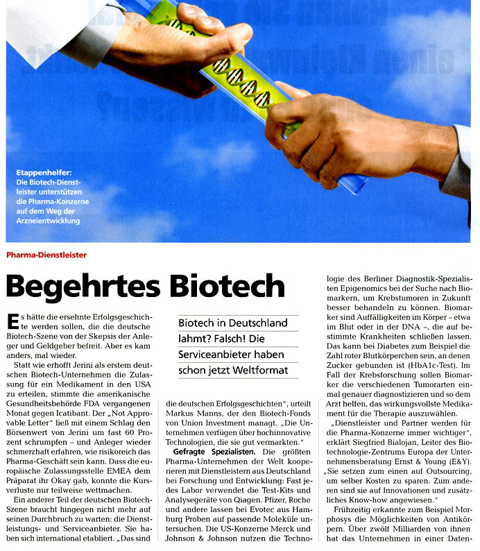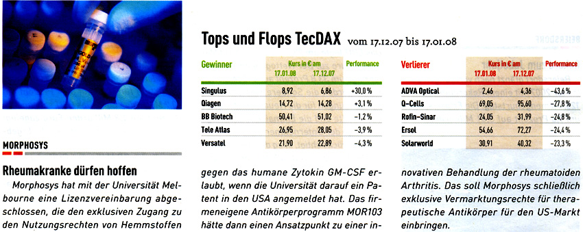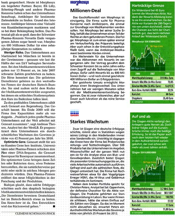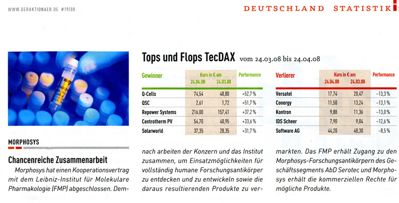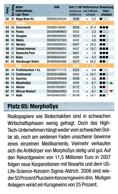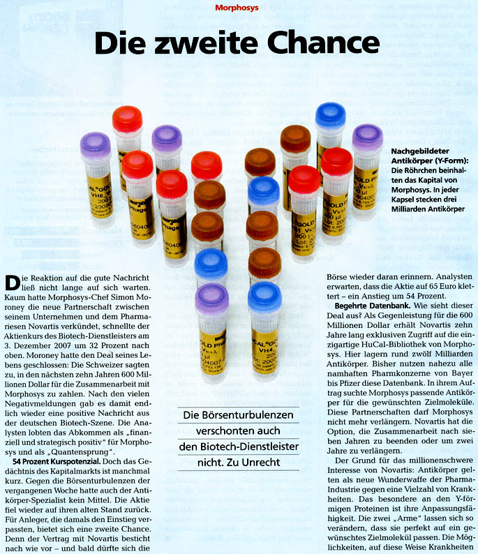 Da ich kostenlosen Zugang zu Zeitschriften wie Focus Money, Wirtschaftswoche, €uro am Sonntag, €uro, Capital, Börse Online u.a. hab, stelle ich hier Berichte für Morphosys-Interessierte zur Verfügung. Kein Anspruch auf Vollständigkeit.