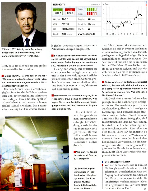 Sie müssen uns zum Kauf empfehlen. Wir haben 17 Substanzen in der klinischen Prüfung und davon 15 Partnerprogramme, die uns nichts kosten. Jedes Produkt, das auf den Markt kommt, ist reiner Gewinn. Derzeit sind 30 therapeutische Antikörper auf dem Markt, die insgesamt 30 Mrd. Dollar Umsatz einbringen. Das Zukunftspotenzial ist enorm.