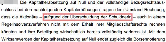 Natürlich ist -je nach bilanzieller Situation- durchaus denkbar, dass für die Altaktionäre kein wirtschaftlicher Wert übrig bleibt. Dann ist ein Schuldenschnitt und/oder Tausch ins EK und die Einwerbung von Neuaktionären natürlich sinnvoll und wegen dem Obstuktionsverbot auch gegen die Ablehnung der Anleihegläubiger durchführbar. Das werden die Altaktionäre, die den Plan erstellen werden jedoch nicht vorschlagen wollen.
