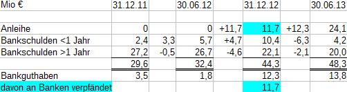 Wie Du zu recht schreibst STEIGEN die Verbindlichkeiten lt. Bilanz ggü. Kreditinstituten IN 2012 um rd. 2,9 Mio. EUR. Gleichzeitig sind die 11,7 Mio. Anleihenerlös in 2012 enthalten.