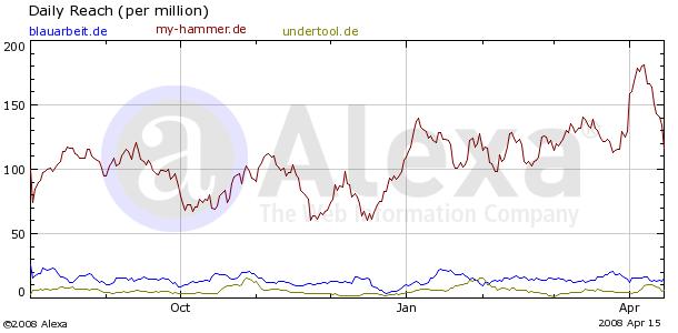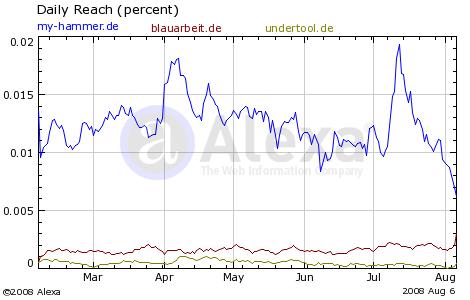 My-Hammer hat die Werbeaktivitäten, z.B. mit Google Adwords signifikant reduziert - und das hat leider zur Folge, dass seit der ersten Juli Woche das Traffic Ranking bei Alexa kontinuierlich zurückfällt, während Blauarbeit und Undertool dagegen leicht aufholen können.