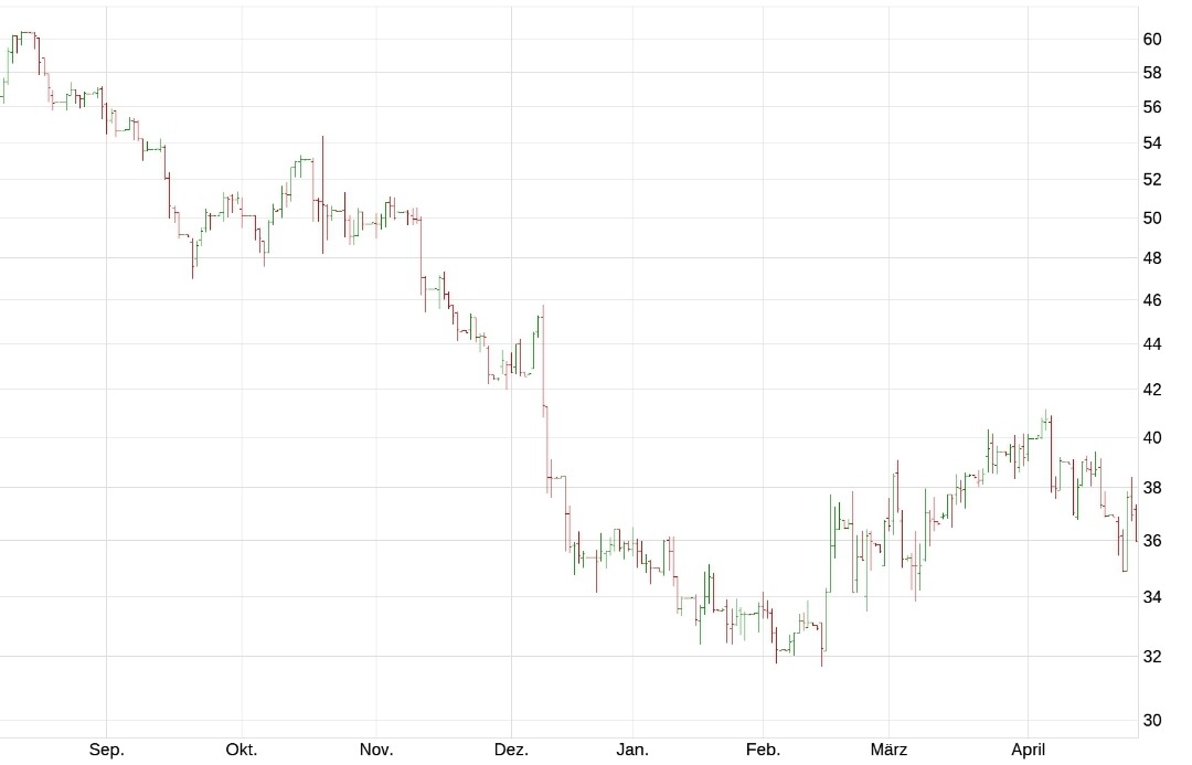 Mit langfristigem Anlagehorizont. Sollte es noch mal runter gehen, kaufe ich gern unten nach. Ansonsten bei 40.
