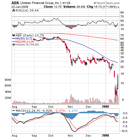 Investors responded positively, sending Ambac shares surging $1.77, or 28.6 percent, to $7.97 Tuesday. The stock is still down 92 percent from its 12-month high of $96.10 set last May, after losing more than 70 percent last week.
