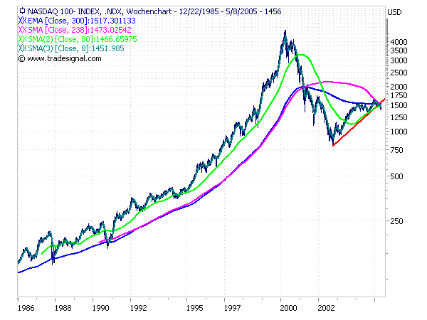 Der Upmove der letzten Tage hat bis dato zu exakten Fibo Retracements von 38,2 % (Downmove seit Märzhoch) bzw. 23,6 % (großer Downmove seit den Tops von Dezember 2004) geführt. Sollte es dabei bleiben, wäre dies ein deutliches Anzeichen hochgradiger technischer Schwäche, das mittel- und langfristig weiteres großes Abwärtspotenzial signalisiert. Ein Unterschreiten der Marke von 1400 Punkten würde kurzfristiges Downpotenzial bis in den Bereich von rd. 1300 Punkten eröffnen.