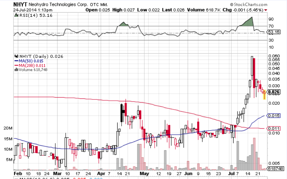 Per 24. Juli 2014 konsoldierte die Aktie auf ca. USD 0,0235 und entspricht dem normalen Verhalten des Papiers. Im April 2014 gab es die erste Runde indem die Aktie von damals ca. USD 0,006 in ein paar Tagen auf sogar USD 0,023 zischte, was überhitzt war. Dann gab es viel Volatilität und das neue Kursniveau lag bei ca. USD 0,012 für Mai/Juni 2014. Der neue Startschuss kam am 3. Juli 2014 als das Papier kurz Intraday bei ca. USD 0,0089 notierte und bei ca. USD 0,012 beim neuen Kursniveau den Börsetag vor den grossen U.S. Feiertagen beendete.