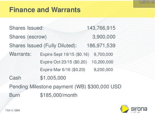 With the recent addition of $1M to the treasury from the exercising of warrants and options, we now have $2M of cash on hand, instead of the amount showing on slide 5. The management team is committed to delivering our business priorities and Sirona is very close to reaching a major inflection point, which is summarized in slide 12.