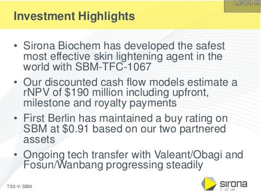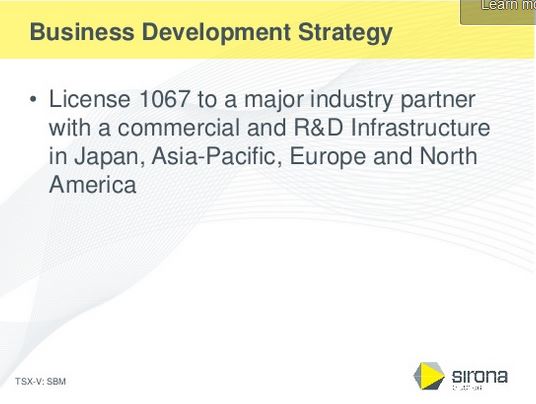 “This cash injection provides the necessary funding for the Company until completion of a licensing deal with SBM-TFC-1067," said Dr. Howard Verrico, CEO and Chairman of Sirona.
