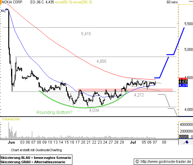 Die Nokia Aktie erreichte im Zuge des mittelfristigen Crashs am 20.06. ein neues Allzeittief bei 4,034 Euro und stabilisiert sich seit dem. Die Bodenformation eines "Rounding Bottoms" wurde mit dem Anstieg über 4,272 Euro am 29.06. aktiviert. Seit dem konsolidiert die Aktie in einer bullischen Flagge intraday, es fand damit ein Rücksetzer an das Ausbruchslevel bei 4,272 - 4,31 Euro statt. Das Kaufsignal ist damit bestätigt, jetzt versucht die Aktie einen Ausbruch aus der Flagge nach oben hin.