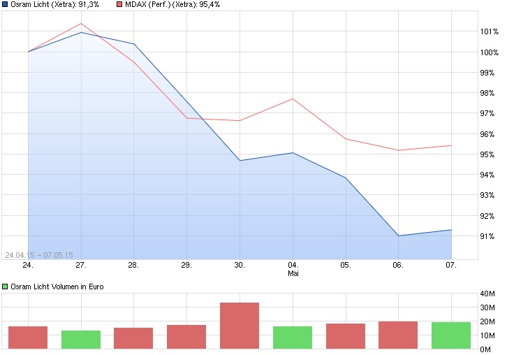 Du darfst auch nicht vergessen, dass Osram den MDAX dieses Jahr bisher um mehr als den Faktor zwei outperformt hat, zwischen Mitte Oktober und Ende April. Dass dann Osram bei ner kleinen MDAX-Korrektur ein bisschen mehr auf den Deckel kriegt, das sollte einen erstens nicht überraschen, und zweitens sollte es einen nicht dazu verleiten zu denken dass Osram jetzt völlig wieder im Boden verschwinden wird.