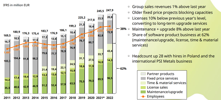 Analog zum Bereich Produktionsmanagement werden auch die angebotenen Lösung im Bereich Energie immer "produkthafter" und Projektrisiken werden damit automatisch sinken. Der Weg vom IT-Dienstleister zu einem Softwarekonzern ist klar vorgegeben und PSI kommt Jahr für Jahr ein Stück auf diesem Weg voran. 2022 lag gemäß der Folie aus #47 der Anteil des "software product business" bereits bei 62%.