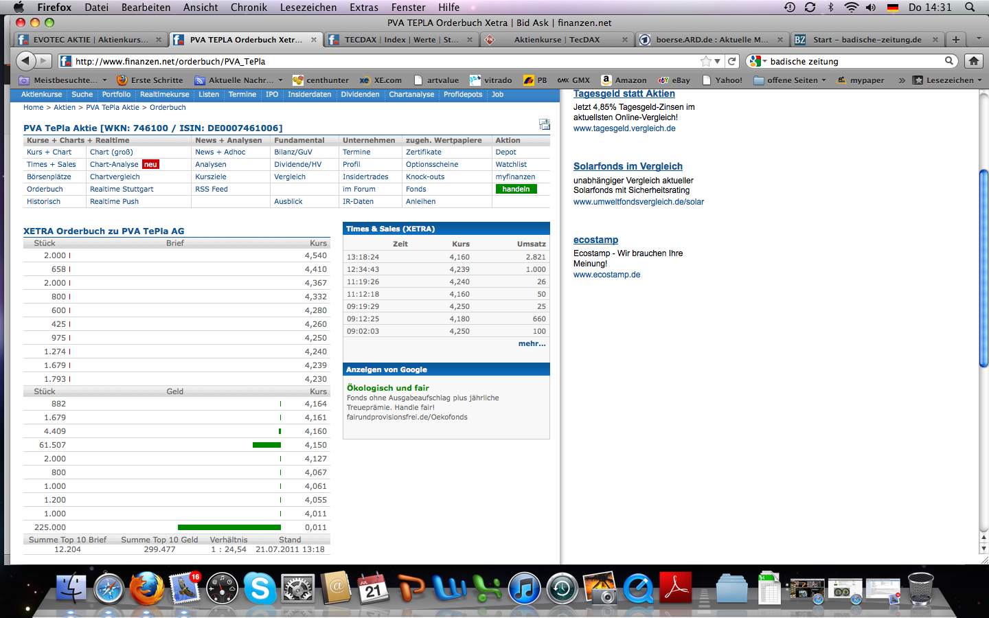 aber als ich vorher ins orderbuch von pva geschaut hab hat es mich fast auf meinem stuhl zerissen, irgendwie kann man da nur noch drüber lachen. nun sind wir doch über das orderbuch nach und nach hinuter manipuliert worden. es geht/ging immer dort hin wo die dicken kauf order plaziert wurden. und nun seht euch mal dieses bild an... die nächste kauforder unter 4,011 liegt bei 0,011... da hätte gerne jemand 225k zu diesem kurs. dann werden wir wohl nie steigen bzw. ist 0,011 dann der nächste stop???!!??? meine güte ist das ein blödsinn in diesem land...