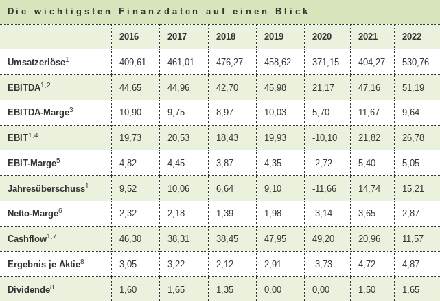 - 2023: Umsatzerlöse: 555,7 Mio. EUR (Prognose: Rund 550 Mio. EUR / i. Vj. 530,8 Mio. EUR), 2024e: 570 Miio. EUR