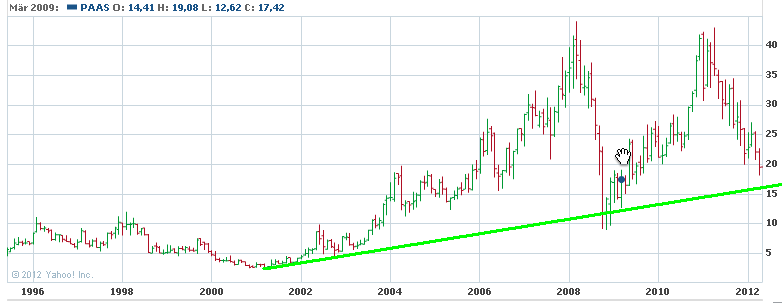 verschiedene Institute wie Goldman Sachs rechnen ja für die nächsten Jahre mit nachlassen­den Goldkursen­, da das Silber an der Entwicklun­g vom Gold klebt, können wir vielleicht­ mit noch weiter fallenden Minenkurse­n rechnen! Wobei es bestimmt immer mal wieder zu Zwischenho­chs kommen wird. Da ist vielleicht­ auch viel Platz zum Traden. Ich persönlich­ bin mal gespannt, ob wir einen Absturz in Raten haben für die nächste Zeit. Vielleicht­ wird sich das Jahr 2009 wiederhole­n, wenn der Superzyklu­s des Goldes zu Ende scheint, vor uns liegt eine spannende Zeit! Denke ein bisschen abwarten kann nicht falsch sein!