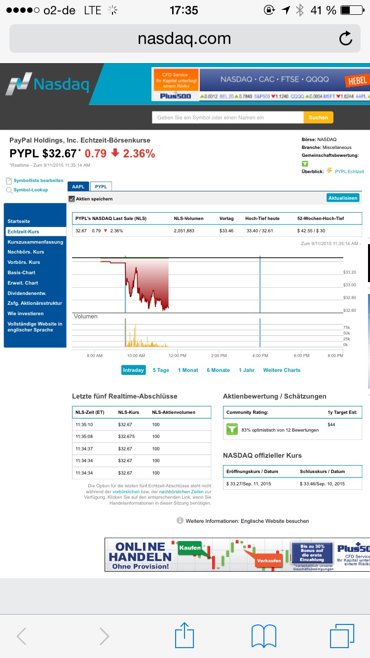 Hab auch nach dem IPO zu 38 EUR gekauft. Am nächsten Vormittag ging auch direkt die Post ab, aber dann habe ich den Absprung zur Mittagszeit verpasst. Egal. Jetzt nutze ich die Aktie eben als Sparschwein und kaufe regelmäßig zu tieferen Kursen nach. Ich bin davon überzeugt, dass ich für jeden investierten Euro mehr rausholen werde. Wenn nicht kurzfristig, dann mittelfristig. Die Aktie ist aus meiner Sicht alles andere als ein Zock. PayPal ist bereits eine weltweit bekannte und etablierte Marke wenn es um Onlinezahlung geht. Onlinekäufe nehmen seit Jahren zu.