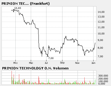 Der Hersteller von Systemen zur Zutrittskontrlle und Zeiterfassung wagte sich 2006 an die Börse. Da sich größere Projekte kurz nach dem Börsengang verschoben, fiel das Papier von seinem Ausgabekurs bei 14,50 Euro bis auf unter sieben Euro. Aufgrund der weiltweit zunehmenden Nachfrage nach Sicherheitskontrollen bewegt sich Primion jedoch in einem absoluten Wachstumsmarkt. Erfolgreiche Akquisitionen und die Fertigstellung der ursprünglich verschobenen Aufträge dürften im laufenden Geschäftsjahr für einen Gewinnsprung rechnen.