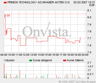 Heute hat die schlechte Gesamt-Marktstimmung zugeschlagen - Gewinnmitnahmen überall, ob bei Solar et al. oder Demag! Hatte ich nicht erwartet und bin einigermaßen überrascht, dass es auch Primion getroffen hat.