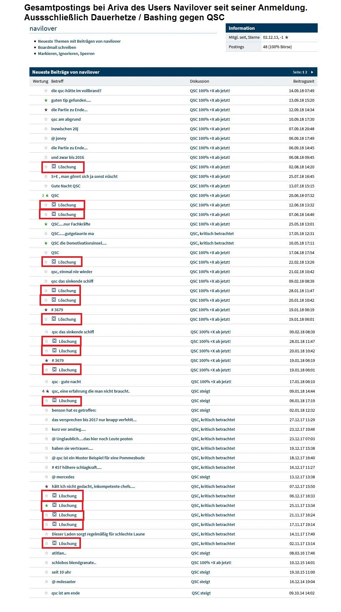 Na, dann hast du sicher auch eine verifizierbare Quelle / Link die du angeben kannst für diese Dinge. Andernfalls wäre es nur ein willkürliche diffamierende Behauptung ohne Beleg. Und angesichts deiner bisherigen "Vorgeschichte" bei Ariva zu QSC ( => d.h. seit 2014 bist du permanent nur am wilden bashen gegen QSV mit reißerischen Untegangsüberschriften, viele Posting wurden gelöscht und zu keiner anderen Aktie postest du bei ARIVA ( was somit etwas den Anschein einer Art "Rachefeldzug" gegen QSC hat und dein Interesse ansonsten weniger der Börse gilt), frage ich mich was deine Motivation für das Ganze ist. Dein allererstes Posting war im Oktober 2014 : "QSC ist am Ende". Sommer 2018 gibt es QSC aber immer noch. Scheint dir irgendwie nicht zu gefallen, daß deine Aussage von 2014 doch nicht eingetroffen ist, stimmts? Und jetzt schreibst du wieder mantraartig fast das Gleiche in deinem jüngsten Posting ohne auch nur einen einzigen belastbaren Beleg dafür beizufügen. Was muß also ein objektiv denkender Mensch daraus schließen, wenn er so ein fast schon fanatisches Posting-Verhalten gegenüber einer Firma sieht? Also ich bin nun seit ca. zwei Jahrzehnten in Börsenforen viel unterwegs und habe sowas eigentlich immer nur erlebt von Leuten die entweder mal viel Geld mit einer Aktie verloren hatten oder von Unternehmen schlecht behandelt wurde, z.B. entlassen wurden. Für Börse selber scheinst du dich ja nicht wirklich zu interessieren. Zu keiner anderen Aktie schreibst du. QSC hat ja die letzten Jahre viele Leute entlassen in diversen Kündigungswellen. Würde mich somit nicht wundern, wenn also auch bei QSC mal jemand aus Rache sich dann in der anonymen Welt des Internets aufmacht es zurückzuzahlen durch Dauerbasherei und falsche Gerüchten. Von daher wäre es mal langsam an der Zeit, daß du mal etwas genauer schreibst, was dich überhaupt so verbissen negativ antreibt hier einzig und alleine seit Jahren gegen QSC mit persönlichen Diffamierungen gegen die QSC Spitze und ständigen Untergangsbehauptungen zu agieren (so wie jetzt wieder mit unbelegten Dingen wie "wie man aus der Firma hört". Na, alle anderen hören das nicht. Nur du. Woher? Phantasie? Oder legst du den ganzen Tag an dein Ohr an der Firmentür? Bin gespannt, ob du die Courage hast mal Farbe zu bekennen was dich wirklich antreibt. Wäre vielleicht interessanter als mantrartige Bash-Postings ohne Quellen.