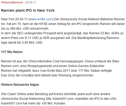 RENREN IPO folgt dann.