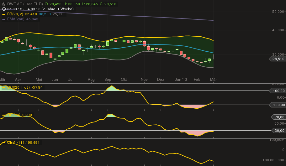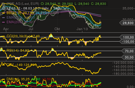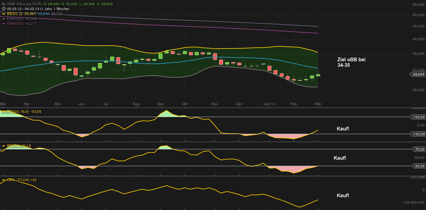 Auf Wochenbasis sieht man schön den Durchbruch des CCI...und dem Signal auf "Kauf"....daher nehme ich an, dass der CCI auf Dailybasis im vorherigen Post noch steigend ist....RSI hier kurz vor Kauf....ich nehme an, dass wir hier das mBB durchschreiten werden mit Ziel oBB bei 35,40...schauen wir mal....ob das nicht Wunschvorstellung ist...