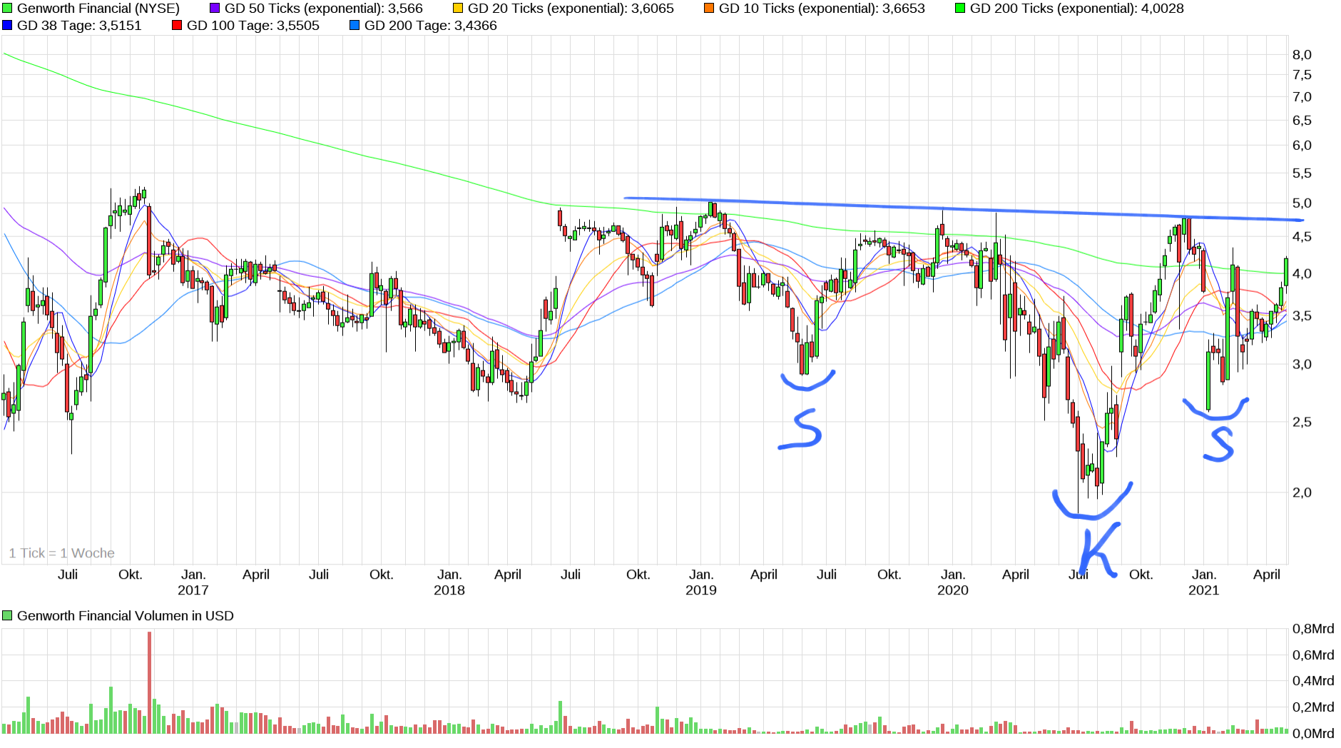 Im Moment zwar fast noch nicht zu glauben, aber die Genworth-Aktie könnte jetzt charttechnisch und langfristig (bis circa Mitte/Ende 2025) in Vollendung der langfristigen multiplen SKS wieder Richtung 9 bis 11 US-$ laufen - falls denn in den nächsten Monaten/Jahren nicht erneut irgendwo gravierende Bankturbulenzen auftauchen.
