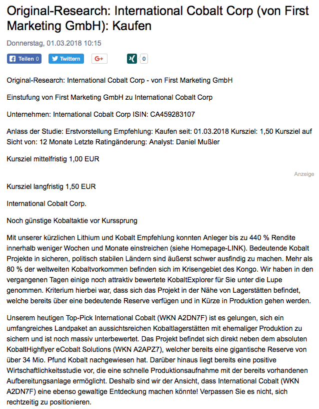 Original-Research: International Cobalt Corp - von First Marketing GmbH