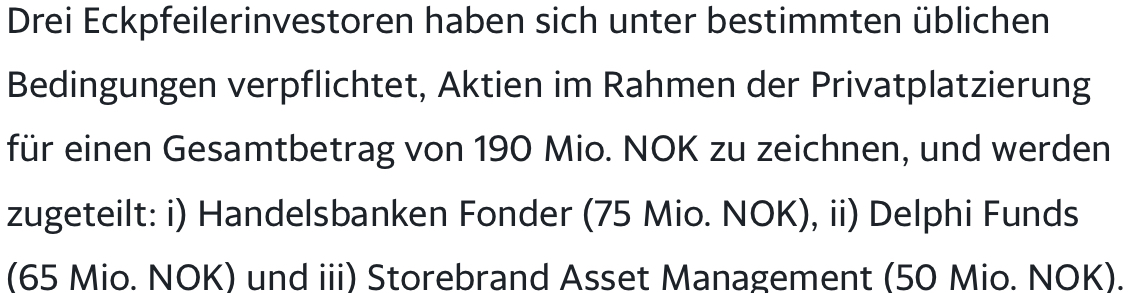 Der Verzicht auf die vorzugsfreien Rechte, die einer Privatplatzierung innewohnen, wird im Interesse der Zeit und des erfolgreichen Abschlusses der Privatplatzierung als notwendig erachtet. Unter Berücksichtigung der Zeit, der Kosten und der erwarteten Bedingungen alternativer Methoden zur Sicherung der gewünschten Finanzierung ist der Board zu dem Schluss gekommen, dass die Fertigstellung der Privatplatzierung zu den vorgeschlagenen Bedingungen zu diesem Zeitpunkt im beiderseitigen Interesse der Gesellschaft und ihrer Aktionäre liegt, und ist der Auffassung, dass die Privatplatzierung den Gleichbehandlungsverpflichtungen des norwegischen Wertpapierhandelsgesetzes und des Rundschreibens Nr. 2/2014 der Osloer Börse entspricht.