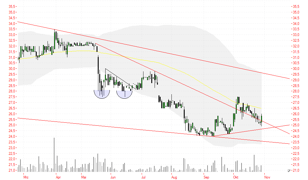 so schlecht waren die Zahlen nicht, deshalb kann ich den aktuellen Kurs von 26 € nicht nachvollzi­ehen, aktuell wird die Aktie zu einem KGV von 8,7 gehandelt bei einer Div.Rendit­e von 4,5% und bei einer lächerlich­en Marktkapit­alisierung­, überlege einen Nachkauf!