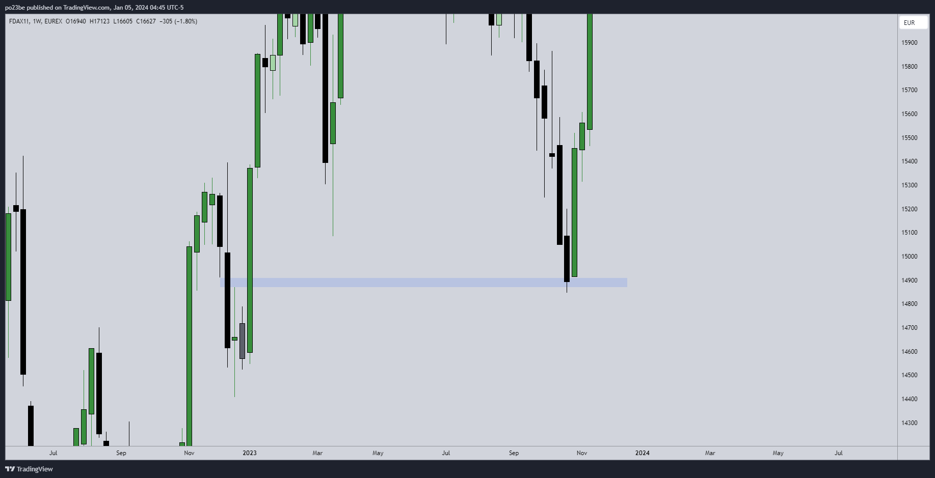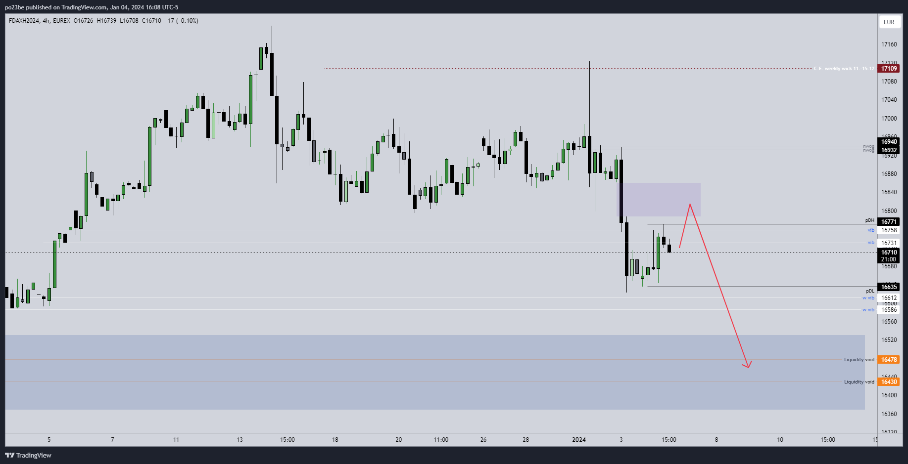 Für den Fdax könnte das heißen, dass der lange obere Wick (daily) vom 2. Jänner besucht wird - bei ca >16950. Halte ich definitiv für möglich und ist für mich derzeit wahrscheinlicher, als dass er jetzt weiter abstürzt. Wäre ein schönes Wochenziel