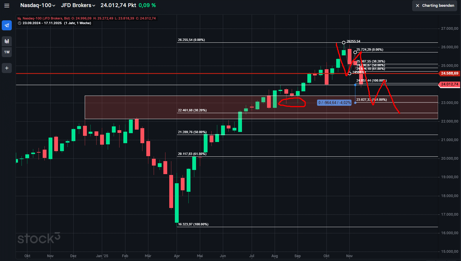 Seit dem Freitagstief wieder 1000 Punkte höher und damit ist die Gegenbewegung eingeleitet. Noch sind wir aber in der Range vom Donnerstag, immerhin wurde bereits das Open vom Do erreicht. Falls mit dem Tief vom Freitag zumindest ein erster Teil einer Korrektur abgeschlossen wurde, wäre jetzt eine Aufwärtsbewegung bis mindestens zum 62-er Fibo angesagt. Wäre von hier aus noch ca 500 Punkte. Dazu muss er zuerst aus der Donnerstags-Range heraus kommen und da ist ganz oben eine Hürde zu überwinden.