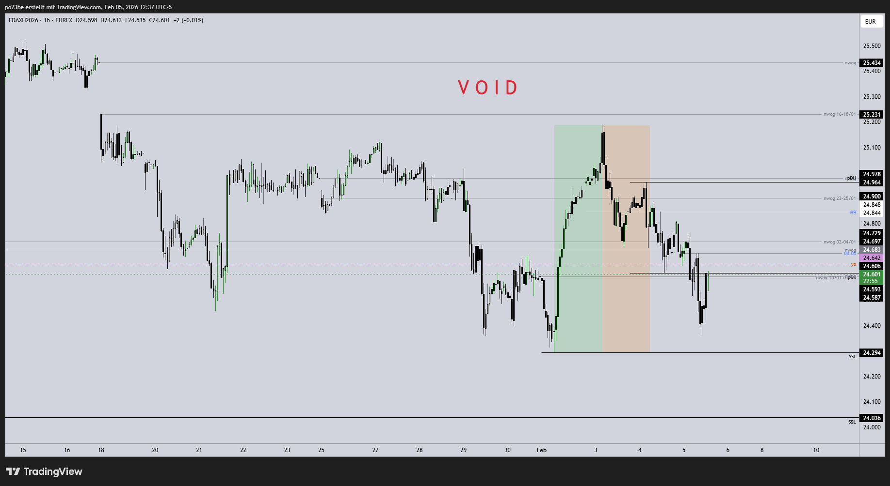 Am Freitag ging ich davon aus, dass der Abwärtstrend in der RTH als Akkumulation anzusehen war aufgrund der korrektiven Bewegung. So gesehen könnte der Taucher unter die Freitags-Range ein vorerst ein letzter Versuch nach unten sein. Bin gespannt, wie die RTH-Session läuft und wo wir heute schliessen.