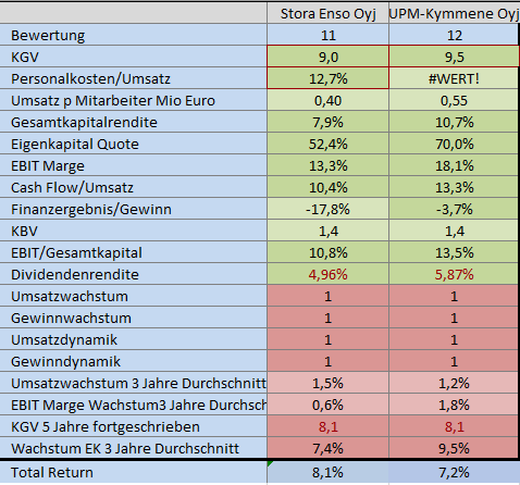 Ich hab hier die Bilanzen 2018 analysiert und die Unternehmen nebeneinander gestellt. Beide sind mit einem KGV von 9 ähnlich günstig bewertet. UPM setzt mit 550K mehr pro Mitarbeiter um. Bei den Margen und Renditen liegt UPM vorne. Beim Buchwert sind beide Aktien wieder gleich günstig bewertet.
