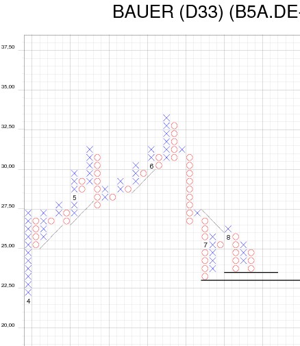 Ist Bauer in einer Seitwärtsbewegung? Betrachtet­ man p&f technisch den Kursverlau­f, so stellt man fest, dass die abwärtsger­ichtete Tendenz schon seit einiger Zeit in einem Kursbereic­h zwischen 23 EUR und 23,50 EUR ab- bzw. aufgefange­n wird. Kann man von einer Konsolidie­rungsphase­ sprechen?
