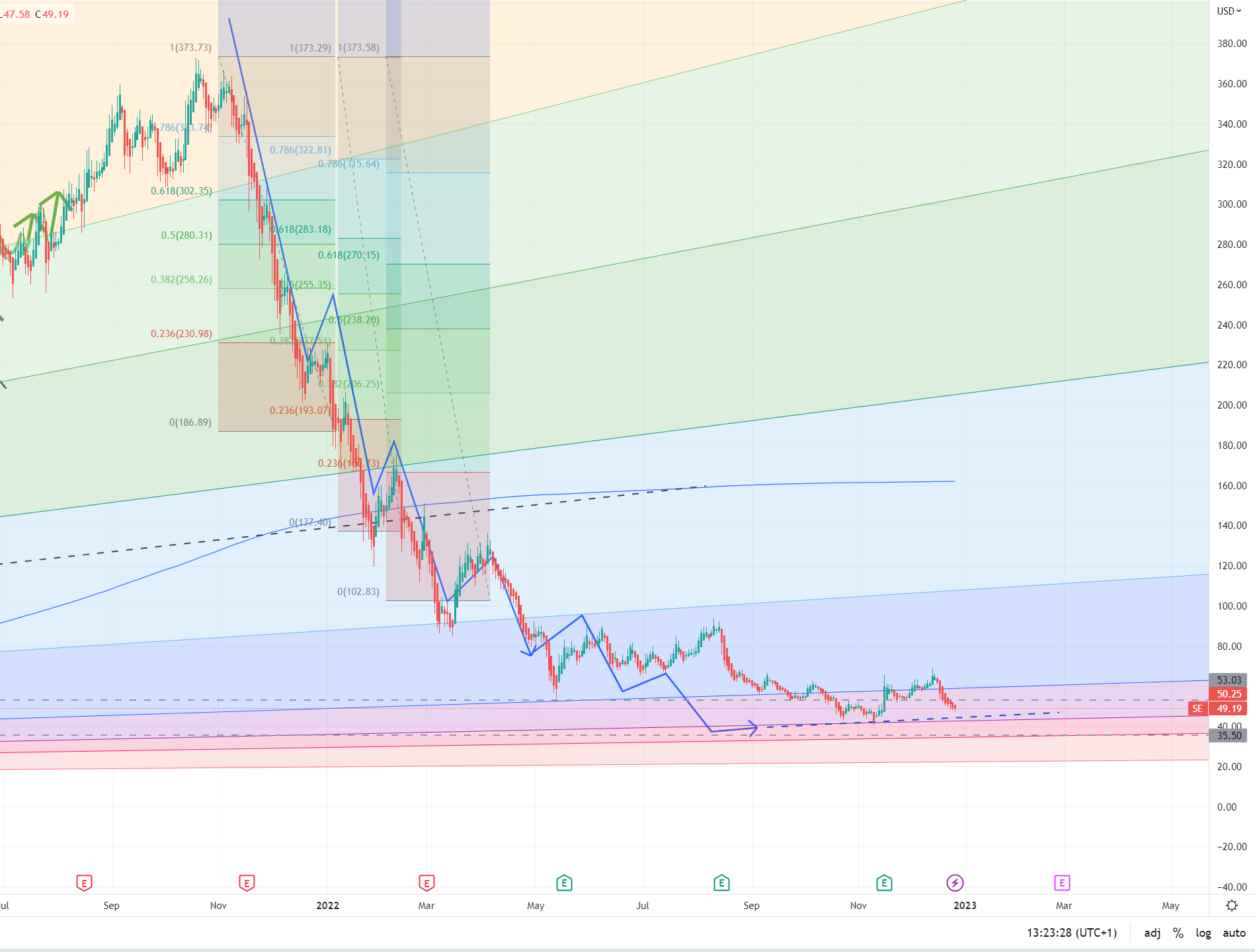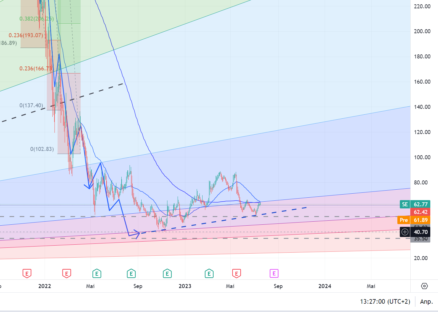 Kursrückgang nach Veröffentlichung der Zahlen mehr als 10% liegt vermutlich daran, dass der cash cow Bereich Digital Entertainment (Garena Fire) sehr stark bröckelt. Zwar noch adjusted EBITDA von 230 Mio. in Q1/2023, aber es fällt auf, dass in der Veröffentlichung SE nur hier mit dem Vorquartal (Q4/22) vergleicht (258 Mio.) anstatt mit dem Vorjahresquartal (Q1/22), wo noch das adjusted EBITDA noch EUR 431 Mio. (und Q1/21 waren es sogar noch 717 Mio.). Tendenz also stark fallend.