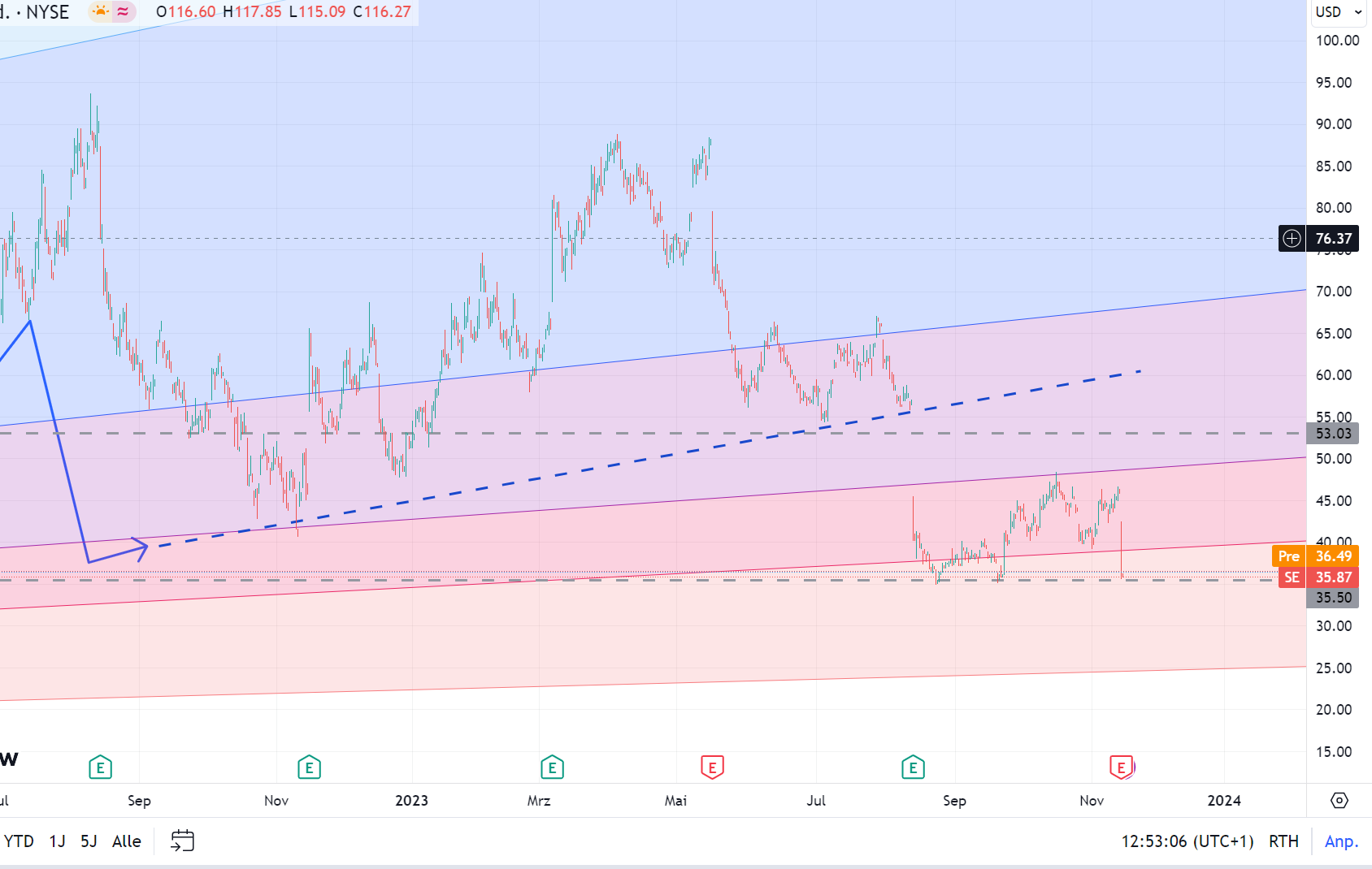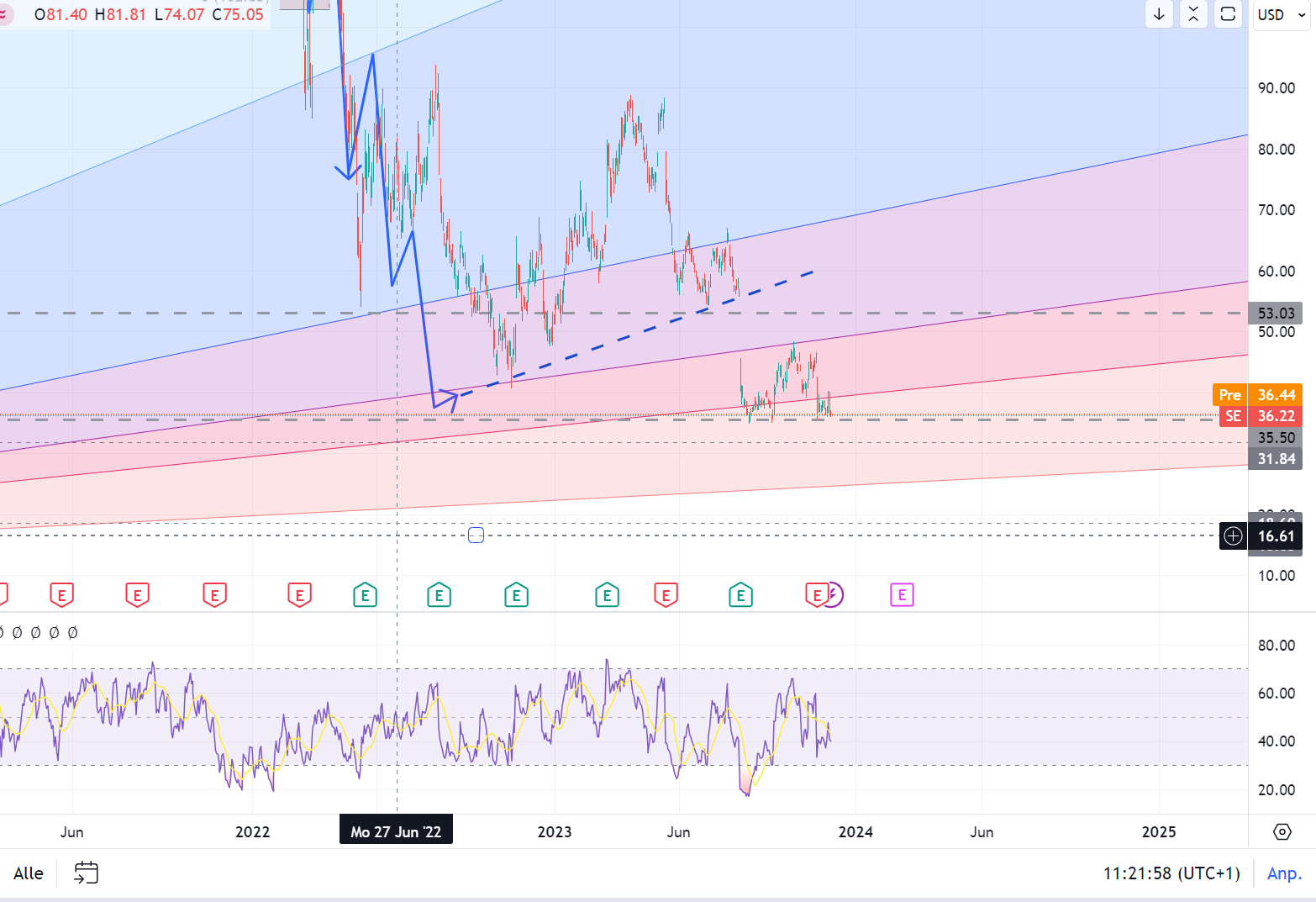 Der Kurs hat wieder auf der U-Linie aufgesetzt, bei einem KGV von knapp unter 40, ist der Wert aus meiner Sicht nicht so ein klarer Kauf