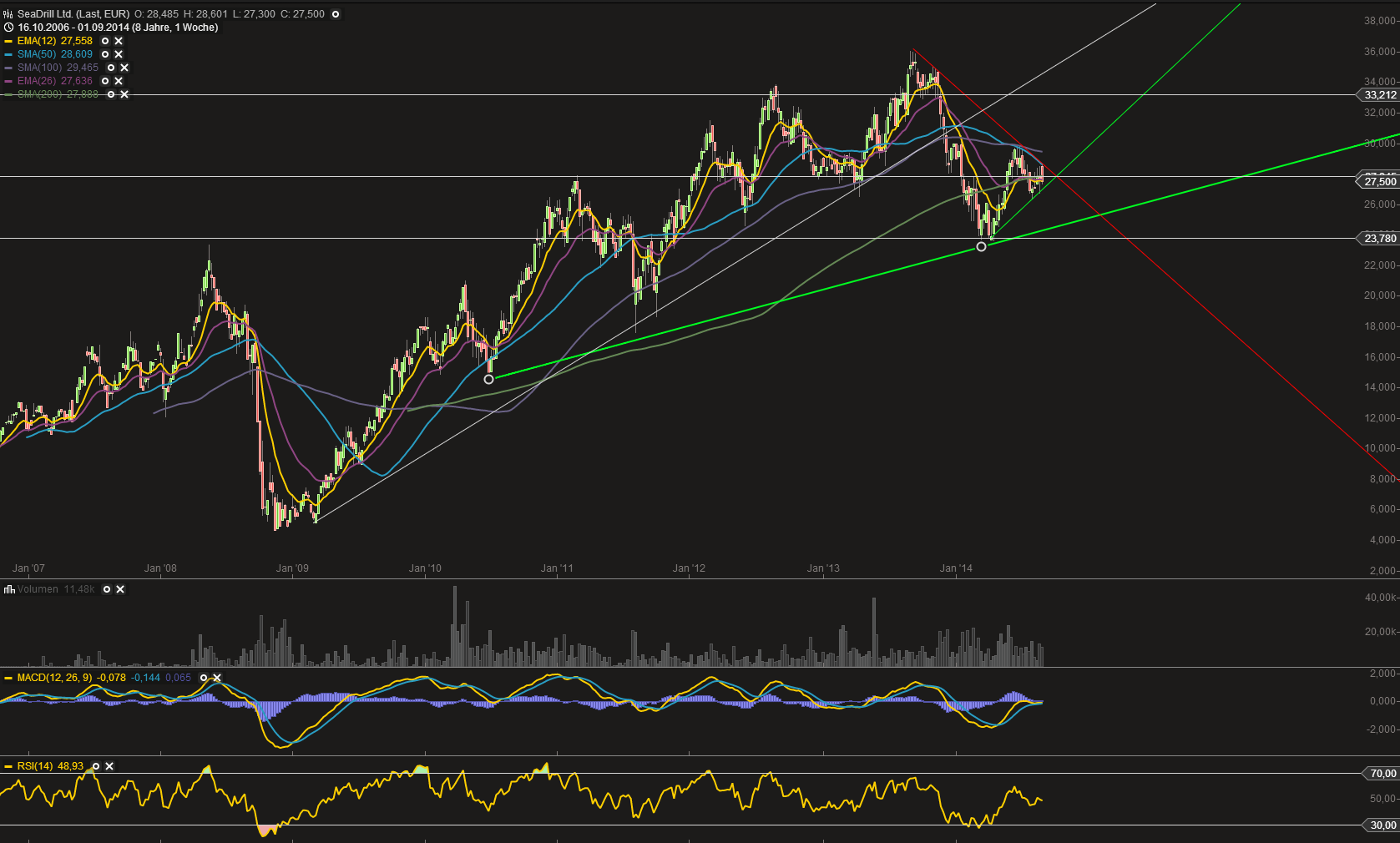 Sofern die Charterraten in 18-24 Monaten nicht wieder anziehen sollten, dürfte Seadrill jedoch seine Dividendenpolitik nicht in der bisherigen Form weiterführen können. Dann könnten wir hier noch einmal deutlich niedrigere Kurse sehen.