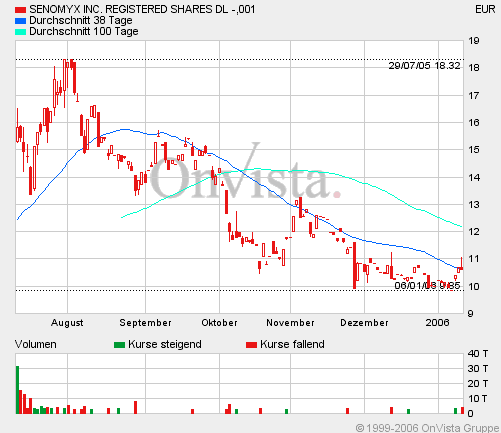 Die Aktienanalysten, die sich zur Zeit mit Senomyx befassen würden seien sich alle einig: Eine Verdoppelung des Aktienkurses im 2006 sollte schon drin sein. Optimisten sähen die Aktie, die heut bei knapp 13 USD notiere, bereits bei 35 USD. Die Risiken seien aber noch erheblich. Das habe gerade die Entwicklung des Aktienkurses gezeigt. Er sei von 22 USD im August dieses Jahres auf 12 USD im November zurückgefallen.